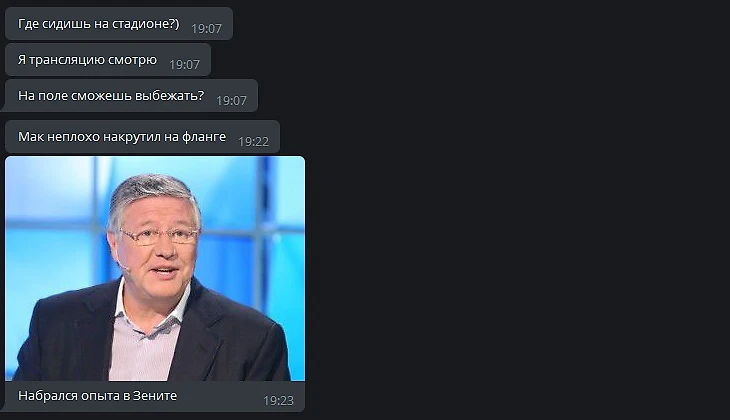 В день матча на станции «Зенит» меня выловила съемочная бригада УЕФА-ТВ. Попросили записать небольшое интервью на английском и снять, как я иду на стадион. Сказали, потом видео попадет на экраны в фан-зонах. Репортер попросил прогноз на счет в матче, я ответил, ничья 5:5.