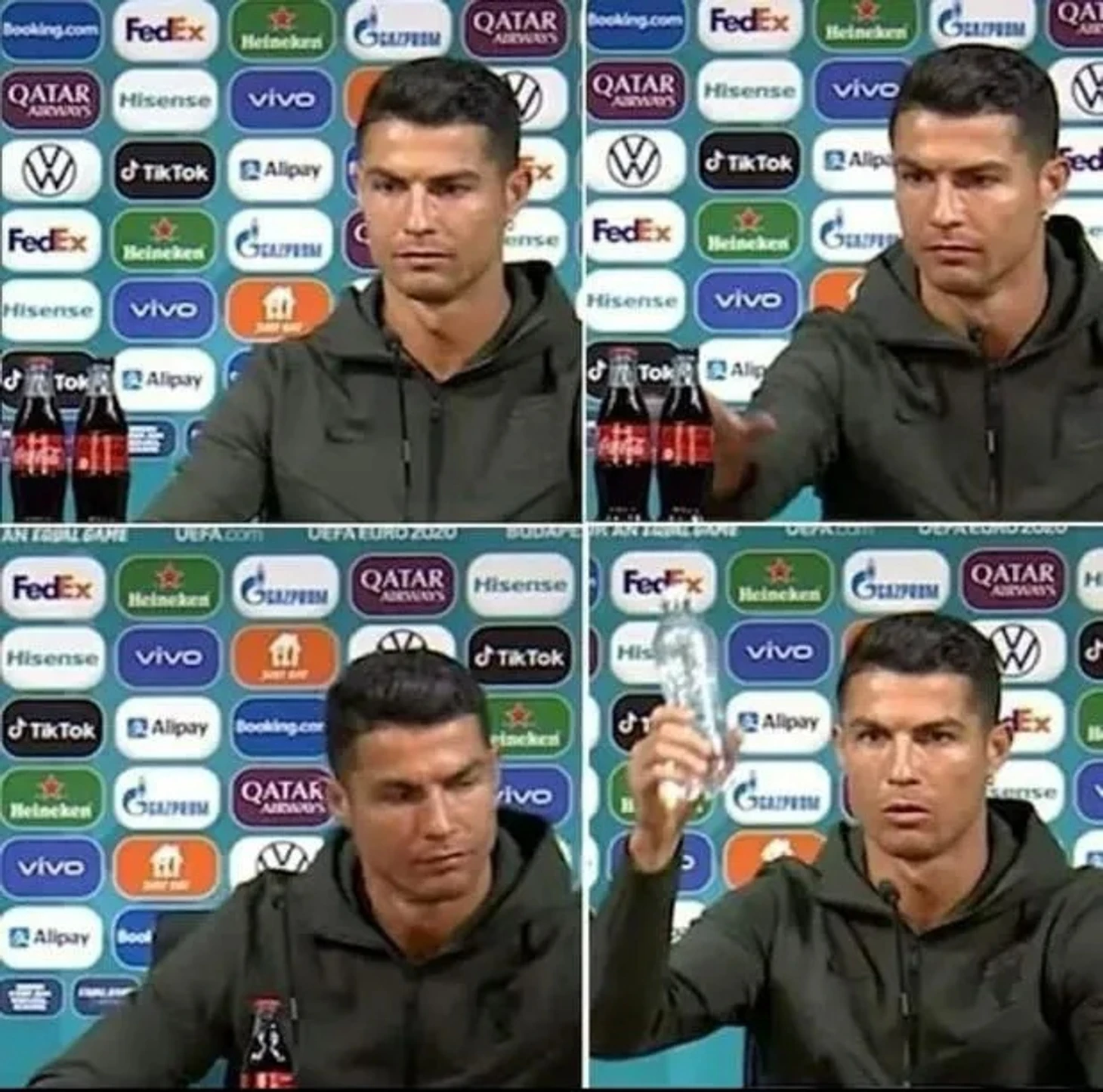 Роналду отодвинул две бутылки Coca Cola, спонсора чемпионата Европы, чтобы взять бутылку воды и с гордостью похвастаться ею, приглашая всех последовать его примеру.