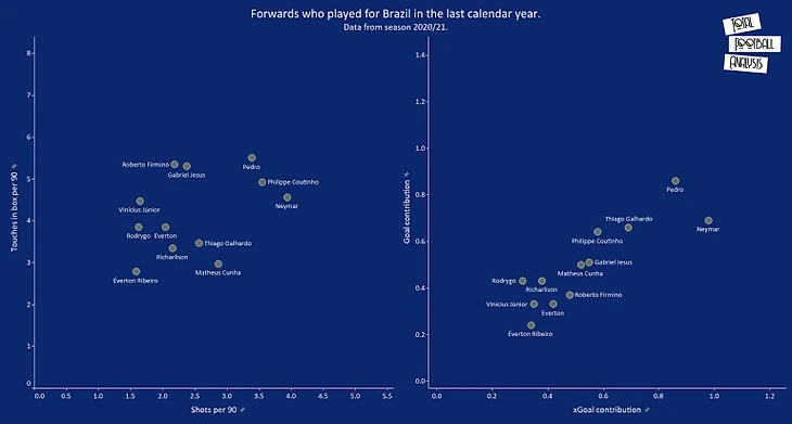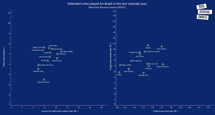 Прежде всего надо дать еще шанс Пакета в роли правого мейя. Уж если Фред освоил азбуку после 2 провальных даже не матчей, а таймов,то и Лукасу это под силу. Если нет, то нещадно критикуемый мной Эвертон Рибейро (есть за что-1 голевая в 17 матчах 2021 года, 15 ключевых передач, для сравнения его дублер Витиньо 5+5 в 21 матче, 31 ключевая), прекрасно усваивает пока свою роль. Выбор латералей пока оптимален. Они в комплексе наиболее сбалансированные в плане «атака-оборона». Для наглядности приведу следующие показатели. Данило и Сандро уступают как чистые оборонцы Милитао и Эмерсону (левое распределение), но в лидерах по продвижению мяча. Цифры даны по результатам прошедшего сезона, в выборке все защитники Селесао,вызывавшиеся в нее за последний год.