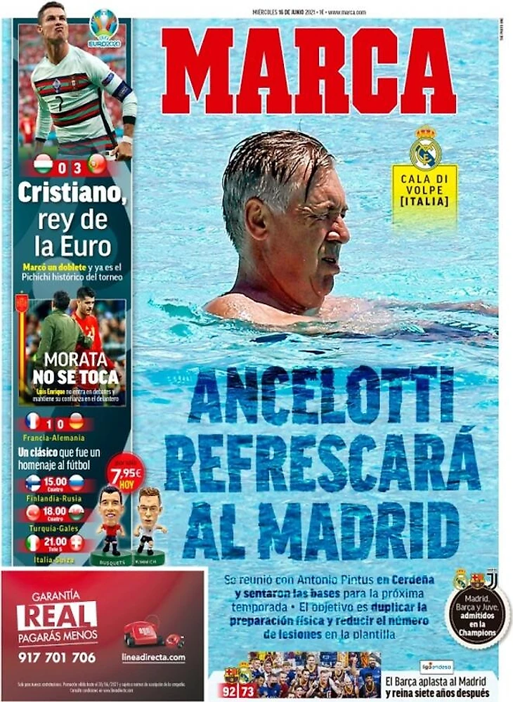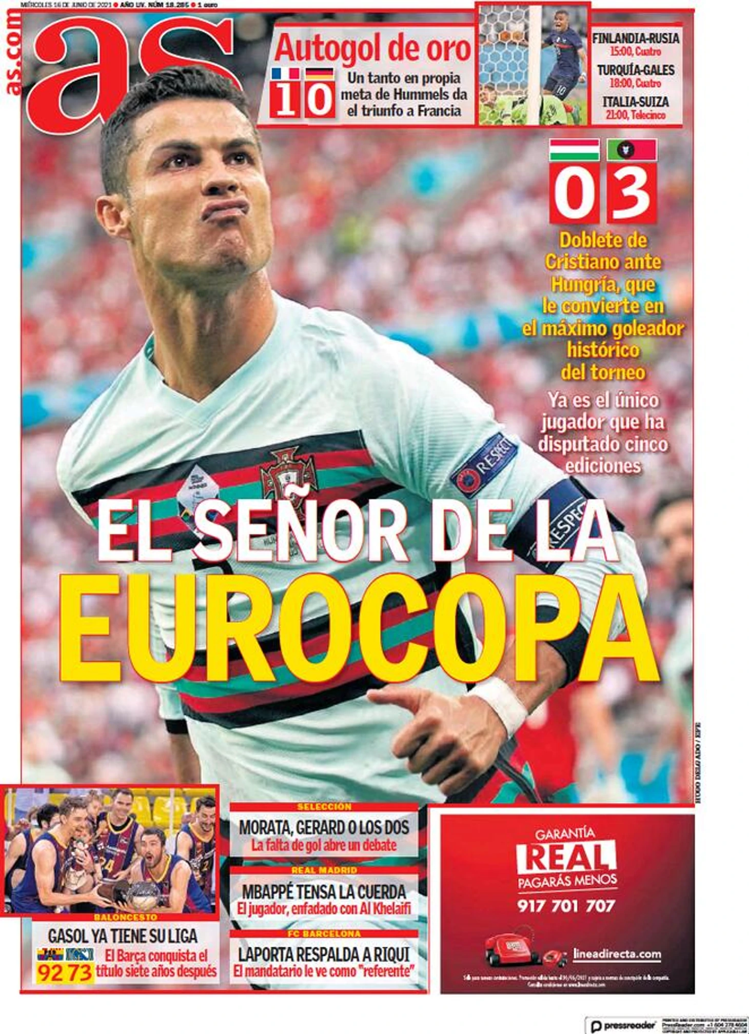 Сборная Португалии убедительно обыгрывает Венгров и дублем в матче отмечается Роналдо, который становится единоличным лидером в списке бомбардиров за всю историю Евро, увеличив свой счёт голов до 11ти и обойдя, тем самым, Мишеля Платини. Для достижения этого результата Роналдо понадобилось участие на пяти турнирах. Так же, в статье обсуждают будущее португальца, которое по-прежнему остаётся под вопросом. По неофициальным данным, выбор Роналдо лежит между четырьмя клубами. В Англии пишут, что «МЮ» сделал предложение с зарплатой в размере 20 млн €, что не является лучшим предложением, так как, понятное дело, самые «вкусные» условия на рынке предлагает «ПСЖ». Но там пока ещё более запутанно всë, молодые таланты правят балом, поэтому Роналдо выжидает. Другие два варианта «Ювентус» и «Спортинг» явно уступают в борьбе за футболиста. «AS» цитирует сообщение матери Роналдо, в котором она говорит, что не знает куда он перейдет, но точно знает, что он чувствует себя прекрасно и планирует ещё поиграть на высоком уровне ближайшие 3 года. Так что, будем считать, времени достаточно для того, чтобы поиграть во всех вышеперечисленных клубах.