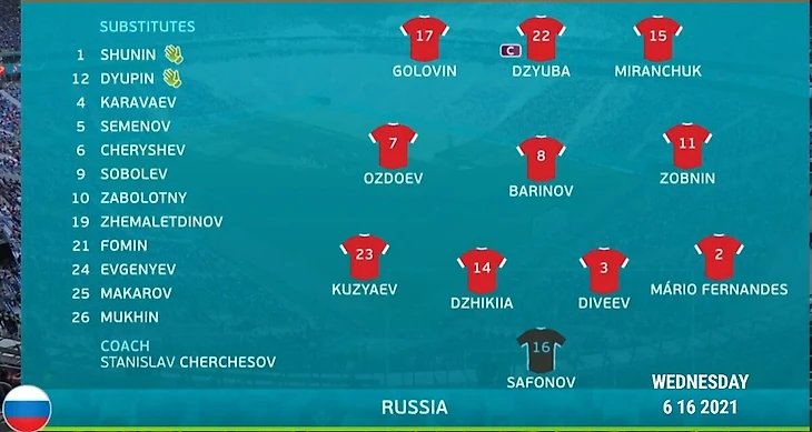 Во-вторых, появился дополнительный центральный защитник – команда вернулась к схеме с пятью игроками в обороне. Баринов перекочевал из опорной зоны на позицию правого центрального защитника, а Семёнов после провала в матче с Бельгией сел на скамейку и уступил место Дивееву. Но на этом не всё: Джикия расположился левее, а Дивеев – в самой середине.