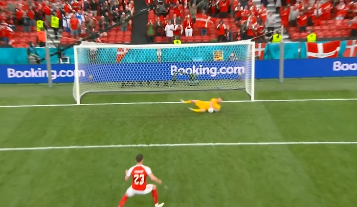 Дания после падения Кристиана Эриксена самой концовке матча датчанам дали настоящий шанс сравнять счет, потому что Градецки всю игру тащил удары соперника с игры. Хейбьерг ударил в правый нижний, Градецки прыгнул туда же – и забрал мяч намертво. Этот пенальти не позволил датчанам взять хотя бы очко (и может в итоге оставить их без плей-офф).