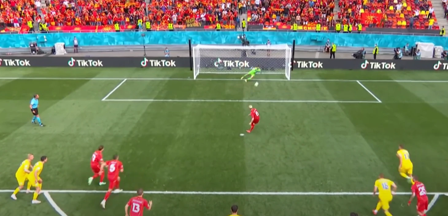 Пенальти был очень важен для македонцев в тот момент. Первую треть второго тайма они контролировали игру, но забить не удавалось. На удивление, пенальти бил не Горан Пандев (может быть, потому что именно он заработал пенальти и получил травму), а левый защитник «Лидса» Эзджан Алиоски. Македонец пробил вправо от себя, на удобной высоте для вратаря.