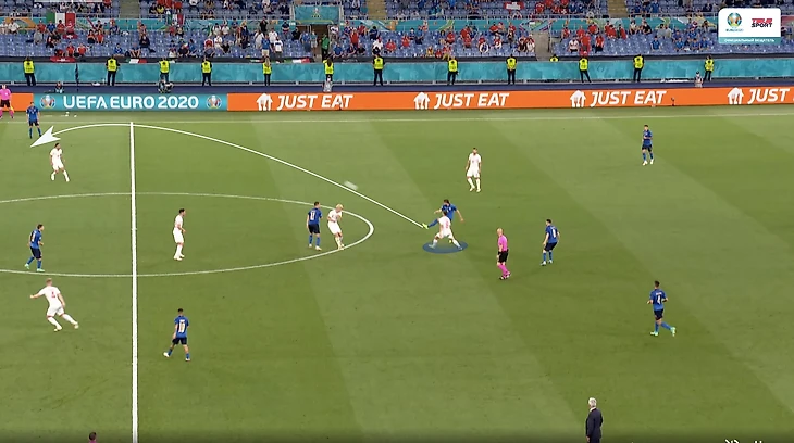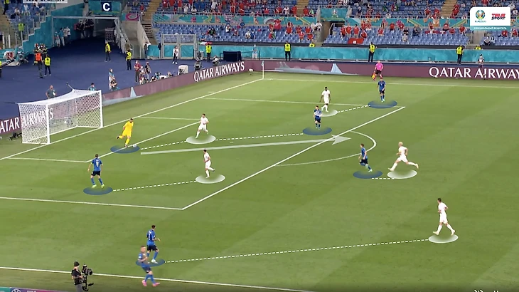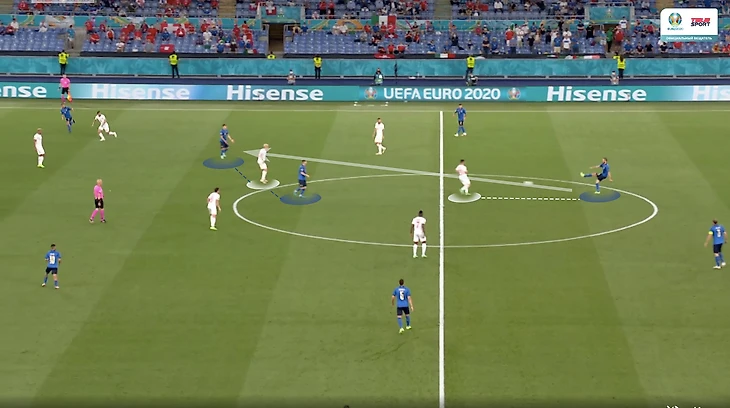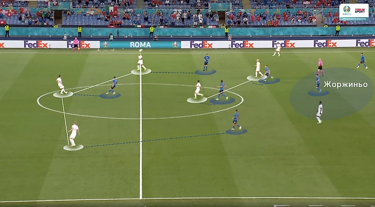 Если против Турции итальянцы провели много времени в средней и финальной третях поля, пытаясь взломать средний/низкий блок соперника, то в этом матче чаще приходилось противодействовать высокому давлению оппонента, осознанно растягивая его горизонтальную компактность и создавая себе пространство для быстрых атак.
