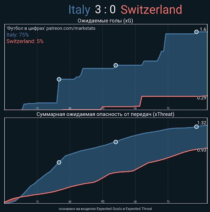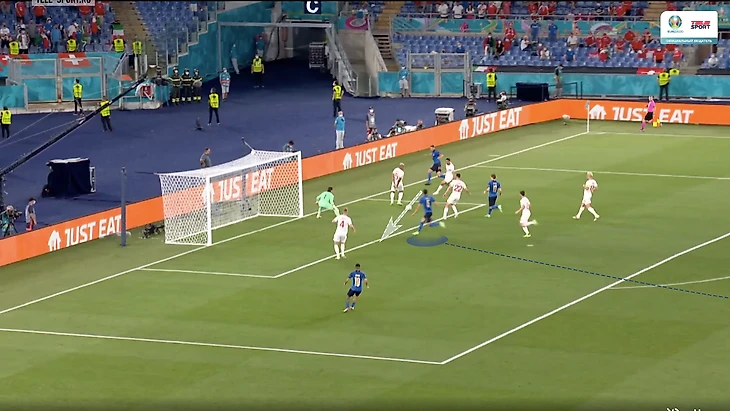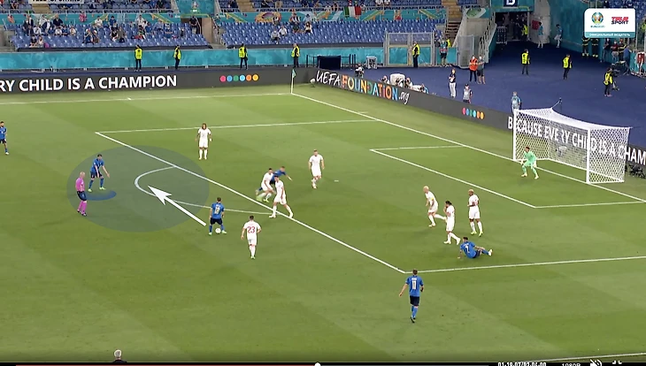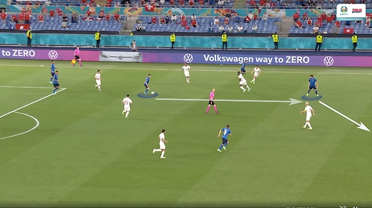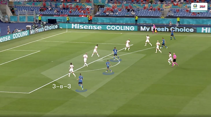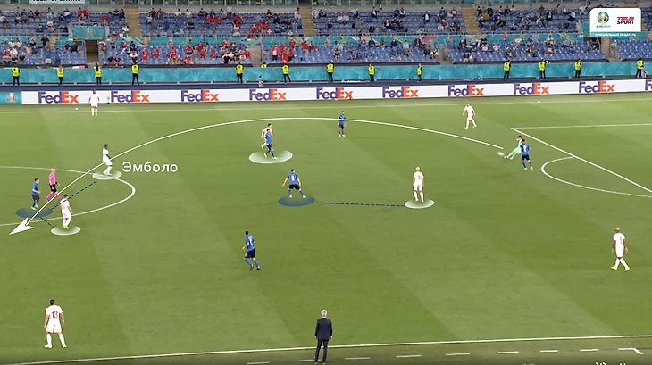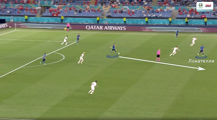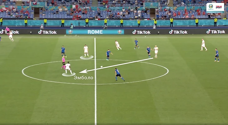 По самой игре стоит добавить, что в середине второго тайма Манчини перешел на схему 5-3-2, выпустив Кьезу в нападение, а правым центральным защитником – Толоя. Этот ход помог укрепить опорную зону. Нападающие Швейцарии уже не могли так легко создавать перегруз в центральной зоне своими глубокими смещениями под мяч, так как с ними могли плотнее играть крайние центральные защитники итальянцев, не боясь оставить брешь в линии защиты. Выход Федерико позитивно сказался и на контратакующей игре.