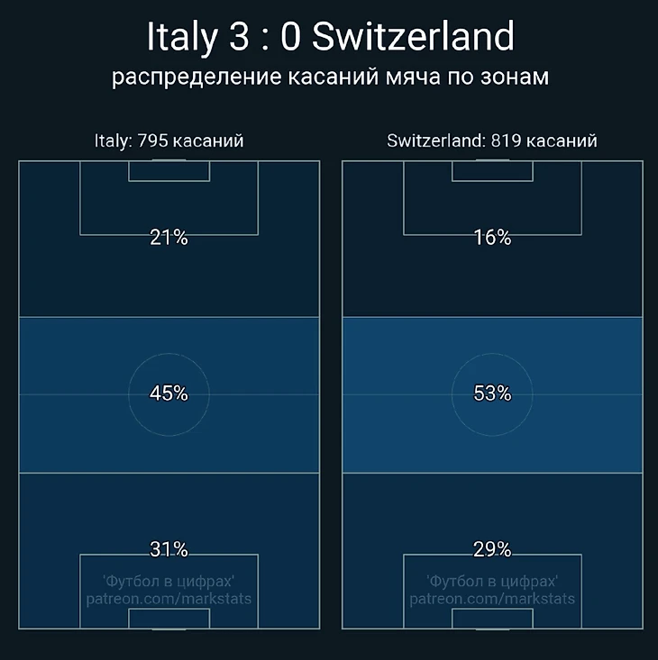 Итальянцы тоже уверенно контролировали мяч благодаря созданию большинства в ключевых зонах. Выше уже было упомянуто, что команда Петковича не стеснялась идти в высокий прессинг и оказывать давление на соперника на их трети поля. Сопоставим этот факт с графиком, приведенным выше: 31% касания итальянцы совершили на своей трети поля. Для сравнения, в матче против сборной Турции было только 19% при большем количестве касаний. Одним словом, получается интересная, отличная от матча первого тура картина.