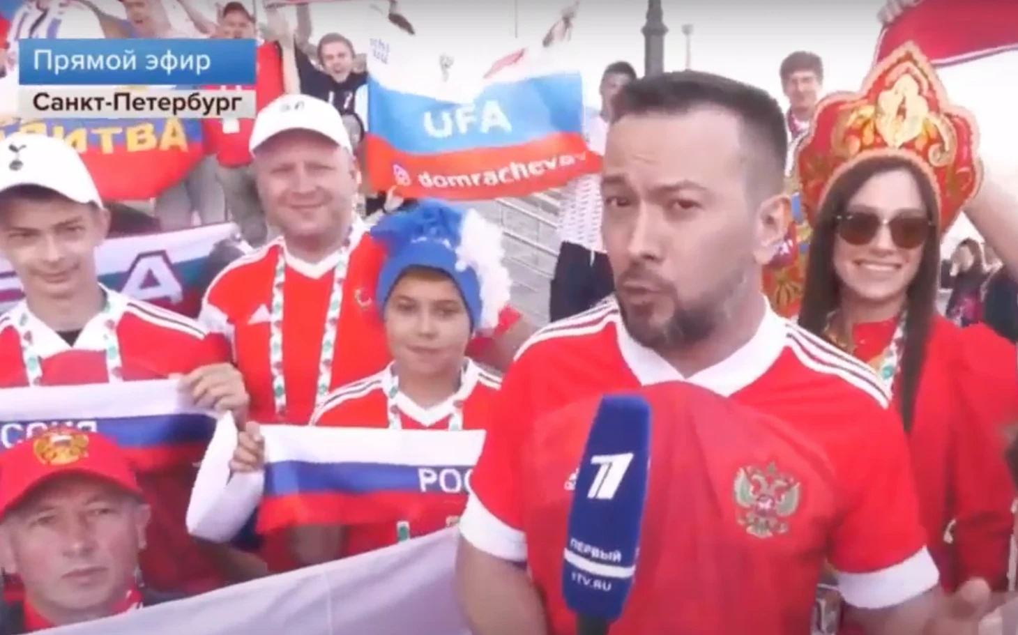 Развлечений не было совсем, поэтому мы решили сами пойти к горе и найти себе приключения. Увидев корреспондента Первого канала, и предвкушая забаву, следовали за ним. Спустя 5 минут погони мы обнаружили точку, где телевизионщики планировали делать предматчевое интервью с колоритными фанатами для эфира новостей. Подкараулили прямой эфир, и аккуратно ворвались сзади.