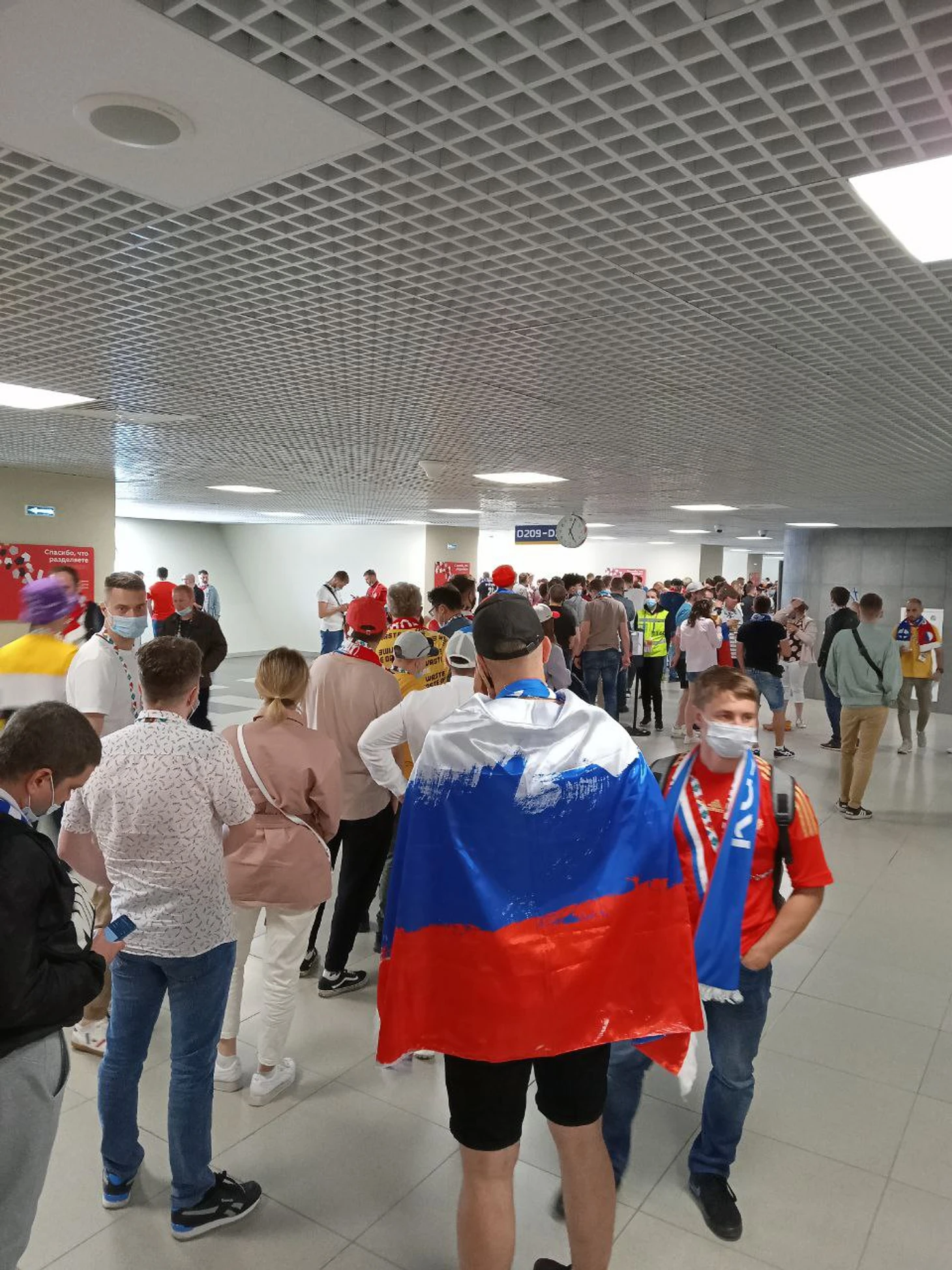Спустя почти час толкотни и терпения забрали документ и погнали на стадион. Если вы идете делать себе fan id в день вашего матча, лучше сразу езжайте на стадион, там реализуете это в разы быстрее. Организаторы понимают, что большинство людей все делают в последний момент, от чего и создается беспросветная очередь в несколько этажей (реально, мы стояли в очереди на даже лестнице два этажа, а затем еще в самой аудитории), именно поэтому и создаются центры выдачи Fan ID на стадионе. Веселье хэс беган. Отправились на стадион, в вагон метро мы зашли вместе с финнами, и началось это: