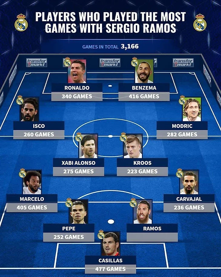 Один нюанс: Икер с Рамосом играли 10 лет, Карим — 12. У Бензема и травм не так много было, да и Серхио травмироваться стал последние пару сезонов, а игр у француза меньше. Не обратил внимания?