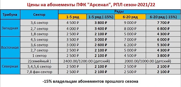 Абонемент дает право посетить 15 матчей «Арсенала» в премьер-лиге, а также матчи Кубка России (до 1/8 финала включительно).