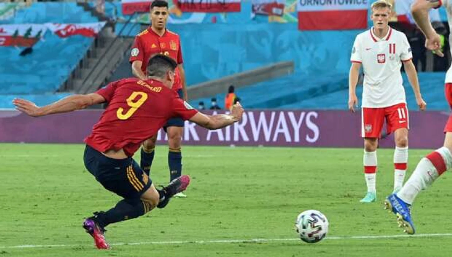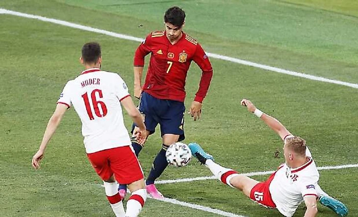 У Испании высокого уровня техника обращения с мячом, но у испанцев нет мастеровитого нападающего с прекрасным голевым чутьем, как Левандовски у Польши. Забивной поляк Роберт Левандовски сравнивает счёт, выиграв верховое единоборство у защитника Испании и пробив точно в угол. Но уже спустя минуту арбитр назначает пенальти в ворота Польши и у мяча Морено, он попадает в шагну, на этом Евро очередное не забитое пенальти уже не сюрприз. После попадания в штангу мяч отскочил прямо на ногу Мораты, и он не попадает по полупустым воротам.