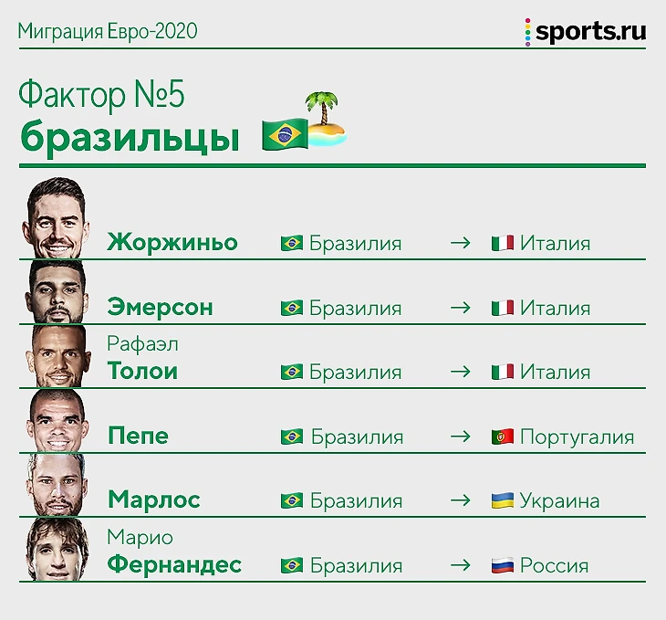 У каждого – своя история. Жоржиньо переехал в Италию в 15 лет (здесь жили родственники), Эмерсон играл за бразильские молодежки, но предпочел Италию (родина матери), Толои получил гражданство после пяти лет игры за «Аталанту» (а еще из Италии родом бабушка и дедушка). Марлос и Марио Фернандес тоже очень долго выступают в лигах своих стран – аж с 2012-го.