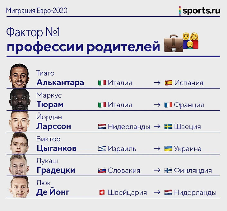 Похожие истории у Маркуса Тюрама и Йордана Ларссона. Маркус родился в Италии (Лилиан Тюрам выступал за «Парму), Йордан – в Нидерландах (Хенрик Ларрсон забивал за «Фейеноорд»). Отец Виктора Цыганкова играл в Израиле больше десяти лет – сын появился в городе Нагария. Люк де Йонг родился в Швейцарии – родители-волейболисты рубились за местные команды.