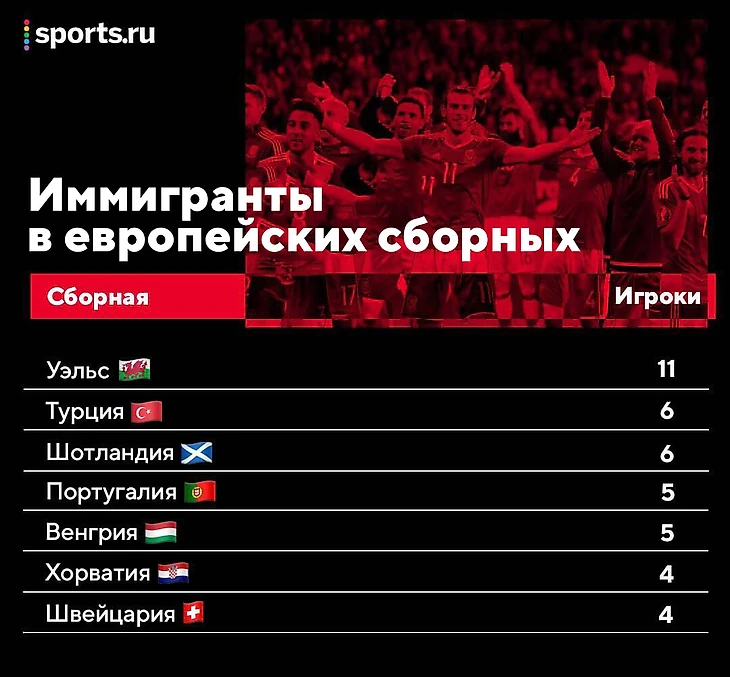 Сборные-лидеры по футболистам с 2+ гражданствами довольно ожидаемые: Франция (17) и Швейцария (16). В заявке Уэльса – девять человек, которые могли играть за Англию. Пятеро бельгийцев имели право выступать за ДР Конго – столько же потенциальных представителей Суринама у Нидерландов.