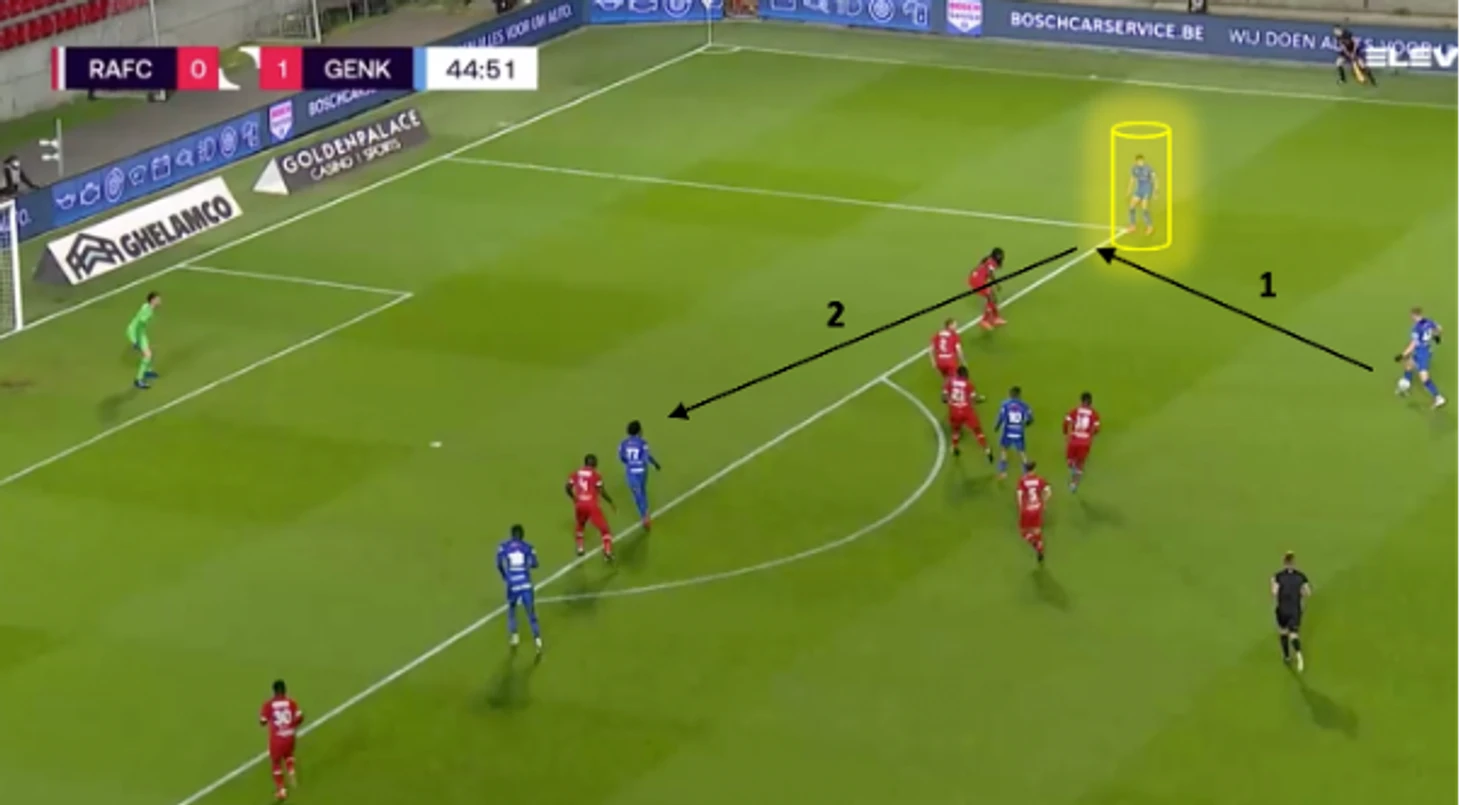 Практически все ассисты (7) в сезоне 2020-21 происходили по следующему сценарию: Муньос получает передачу из глубины на скорости, затем входит с ним в штрафную и либо простреливает, либо откатывает чуть назад под удар набегающему. Совокупно процент точных передач в сезоне составляет 87% (в среднем 56 за матч, главным образом без обострения, key passes - 0.51).