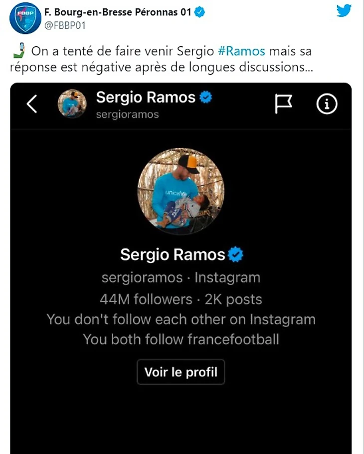 Французский клуб «Бур-ан-Бресс», выступающий в третьем дивизионе, иронично сообщил о предпринятой попытке подписать Серхио Рамоса.