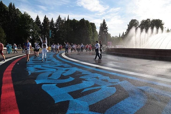 Художник Покрас Лампас снова в деле – расписал площадь у фонтана в Приморском парке Победы на Крестовском острове к матчу сборных России и Финляндии.