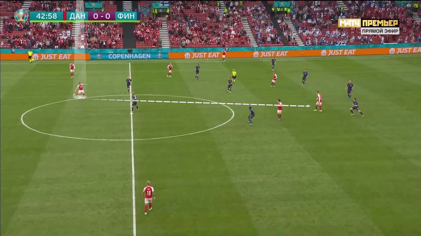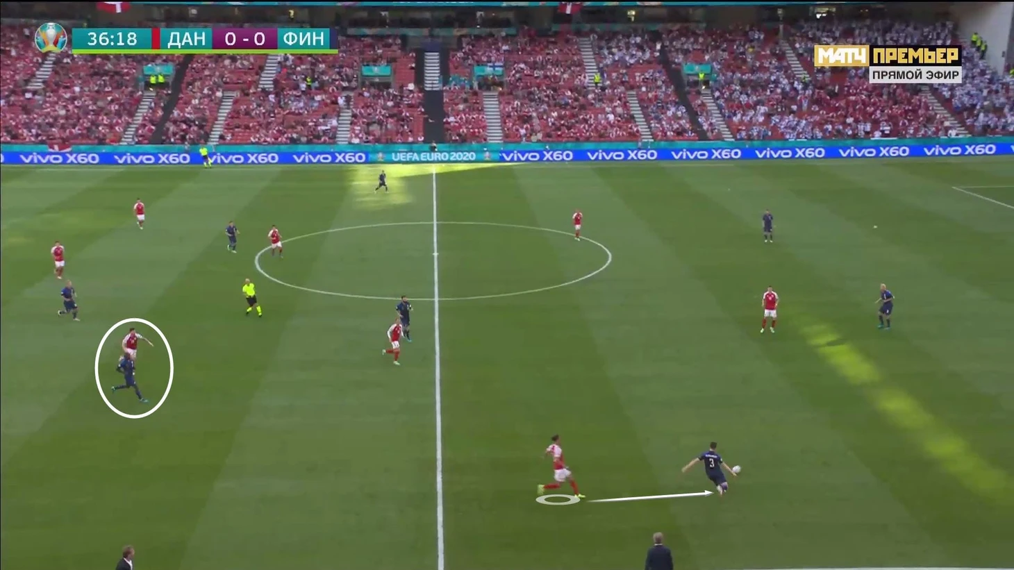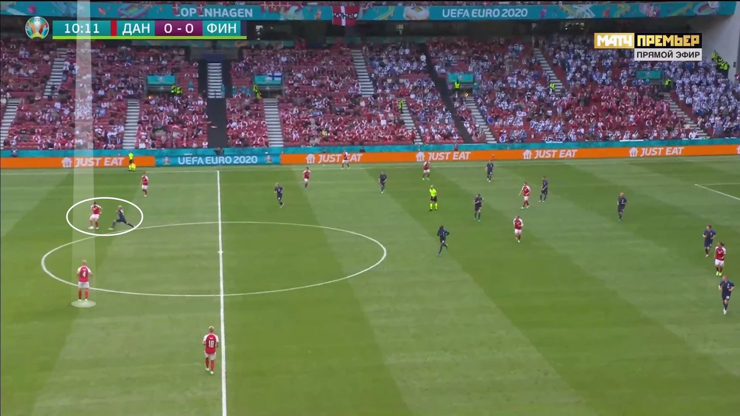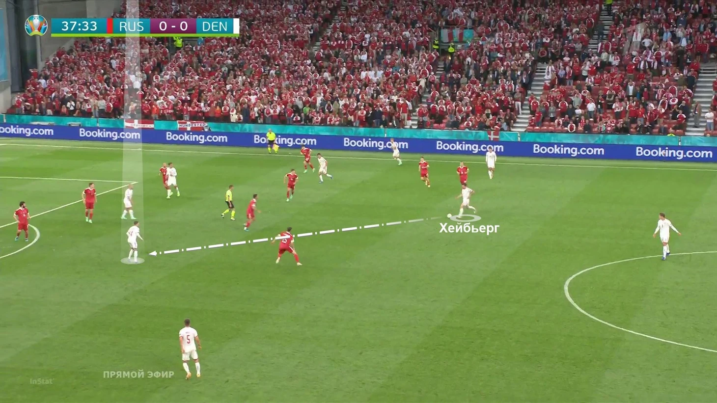 Хейбьерг читает эту передачу быстрее всех. В худшем сценарии у Дании было бы преимущество. В лучшем – возврат владения (так и получилось – Хейбьерг оказался первым на мяче).