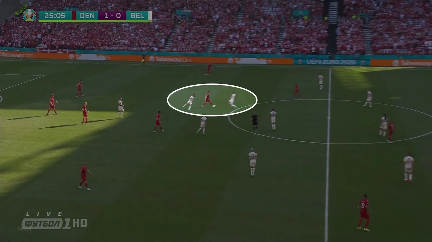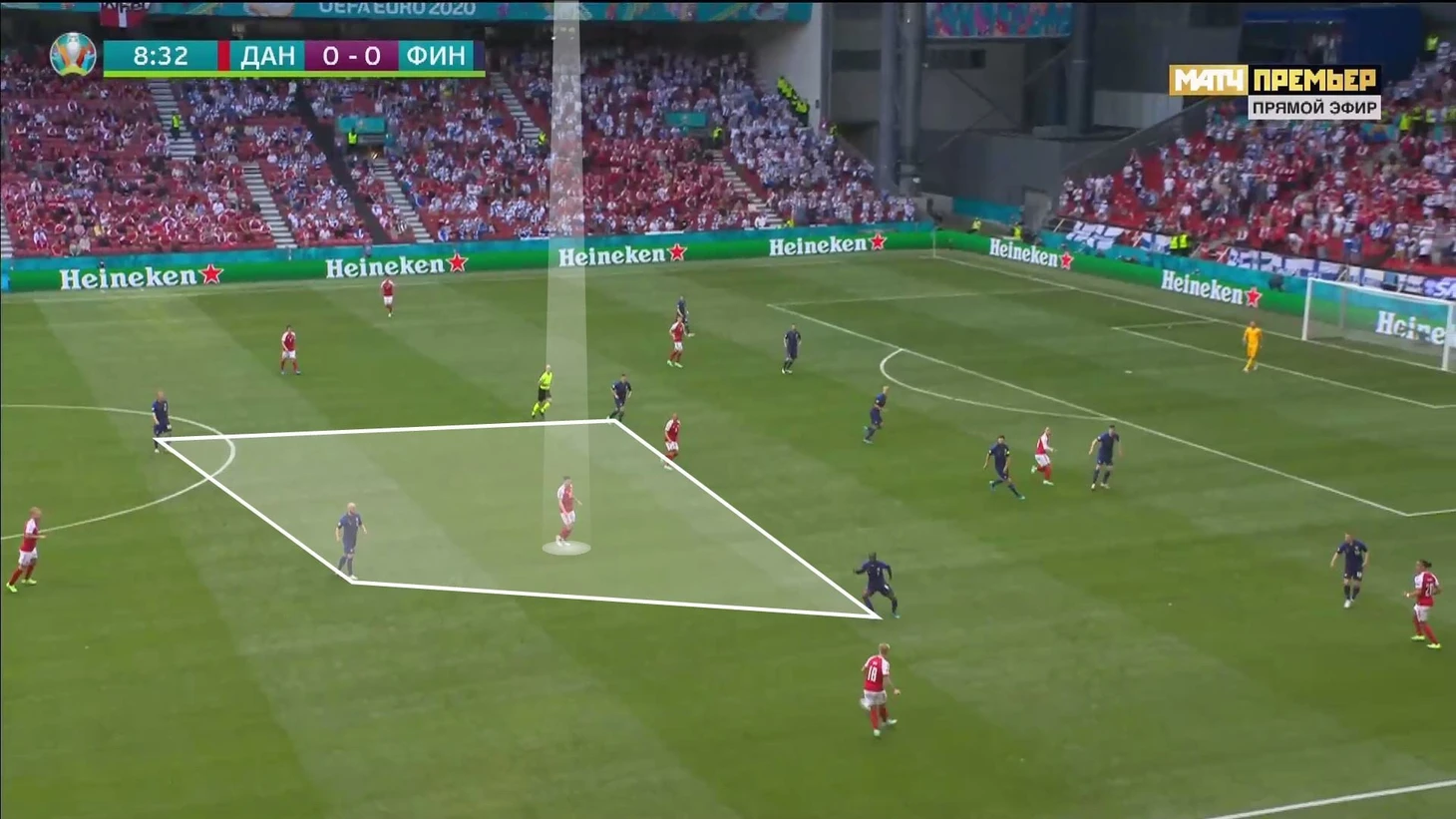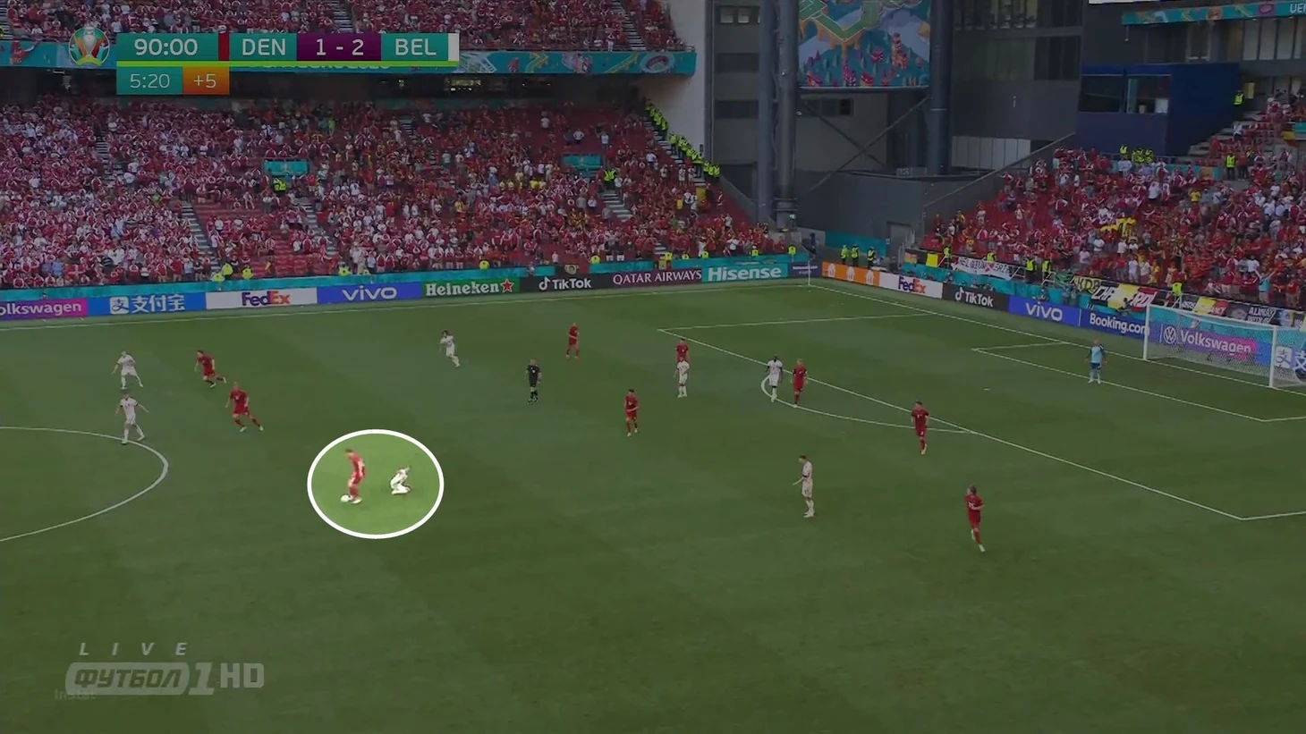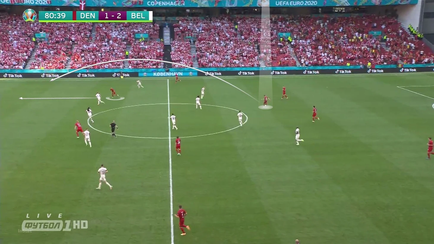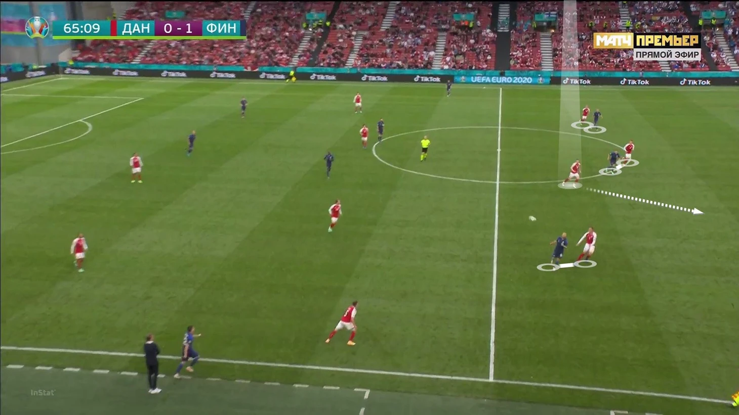 Хейбьерг читает эту передачу быстрее всех. В худшем сценарии у Дании было бы преимущество. В лучшем – возврат владения (так и получилось – Хейбьерг оказался первым на мяче).