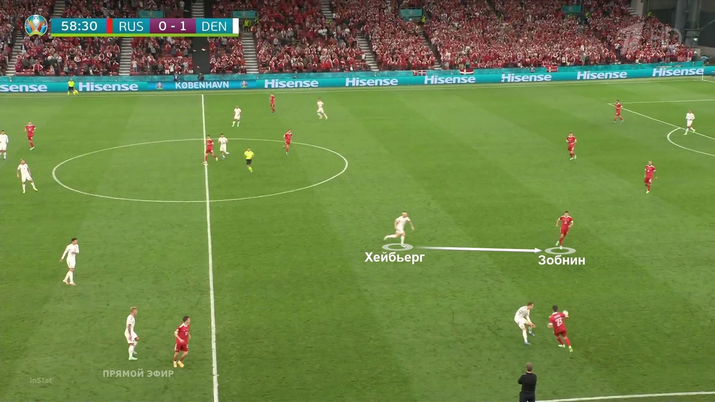 Это качество Хейбьерга оценила и сборная России. Получив свободу после аута, Эмиль разрезающим пасом нашел Дамсгора между линиями: