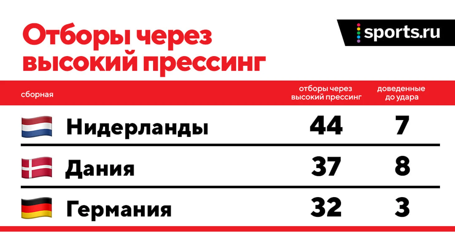 Еще одно достоинство Хейбьерга – оправданно агрессивная игра в прессинге. Это хорошо вписывается в стиль Дании, которая чаще всех возвращает себе мяч через высокий прессинг (и чаще всех доводит такие моменты до ударов):