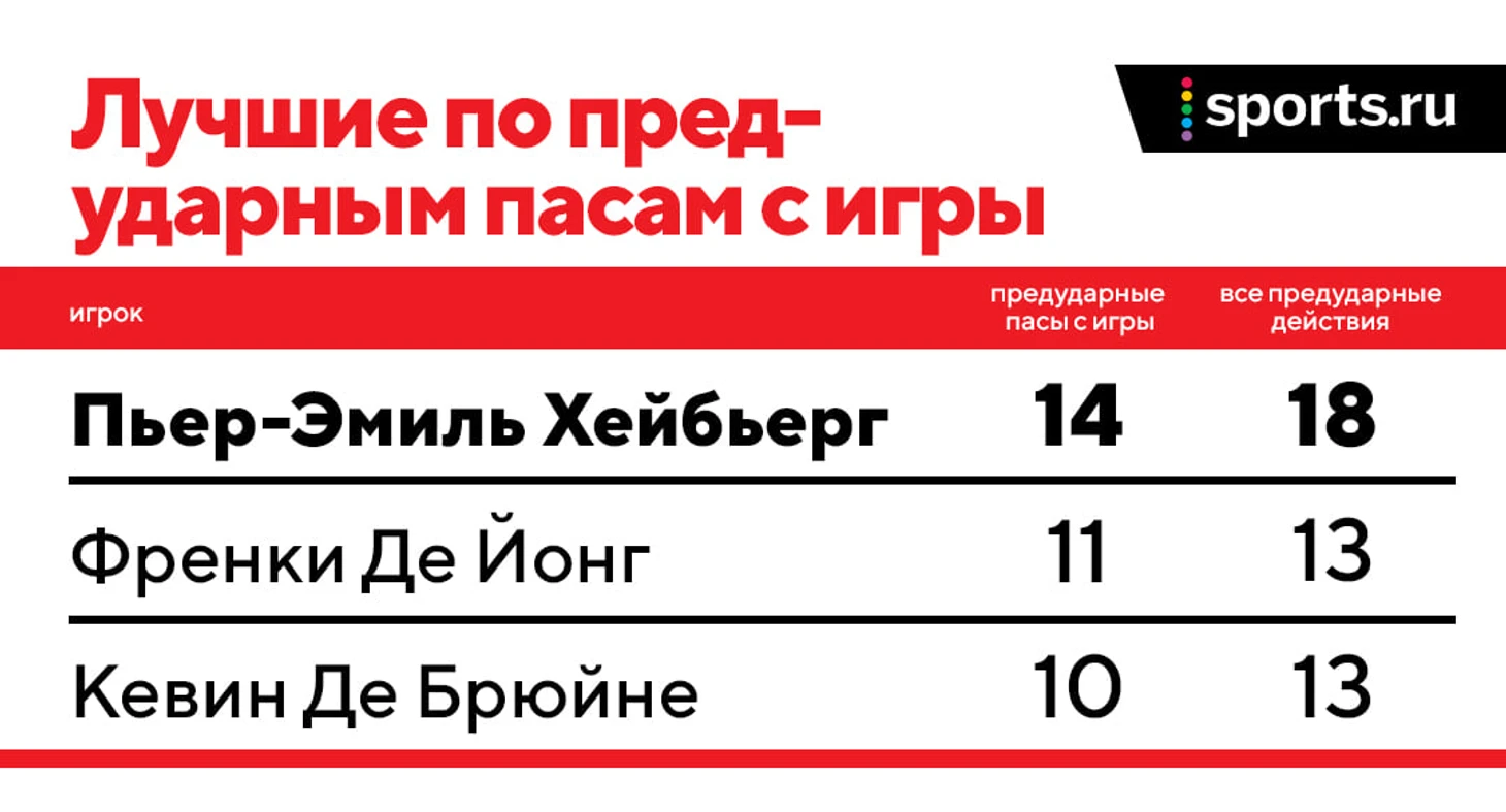 Показатель Эмиля (6,00 действий за игру) – просто космос для опорного полузащитника. Три матча – очень малая выборка, но если бы он удержал этот уровень дольше, то соперничал бы с лучшими созидателями Европы. Это близко к уровню креативных гениев Лео Месси (7,17) и Кевина Де Брюйне (6,40). Этот показатель именно про прямой вклад в острые атаки.