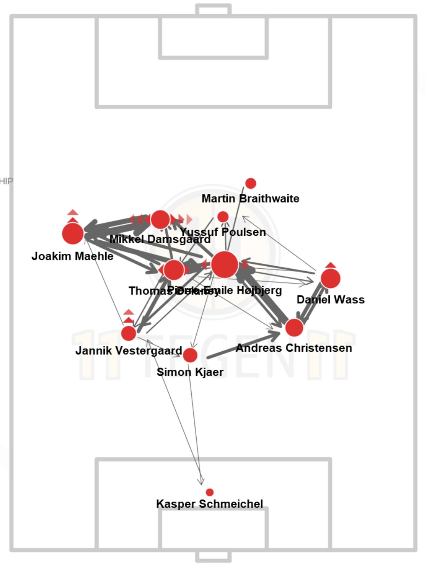 При этом Хейбьерг в первую очередь – плеймейкер. Больше всех получает мяч у датчан (84 паса за игру) и ведет игру из глубины. Созидание для него – лишь приятный бонус. Карта передач Дании против Бельгии подчеркивает его статус управляющего атаками: