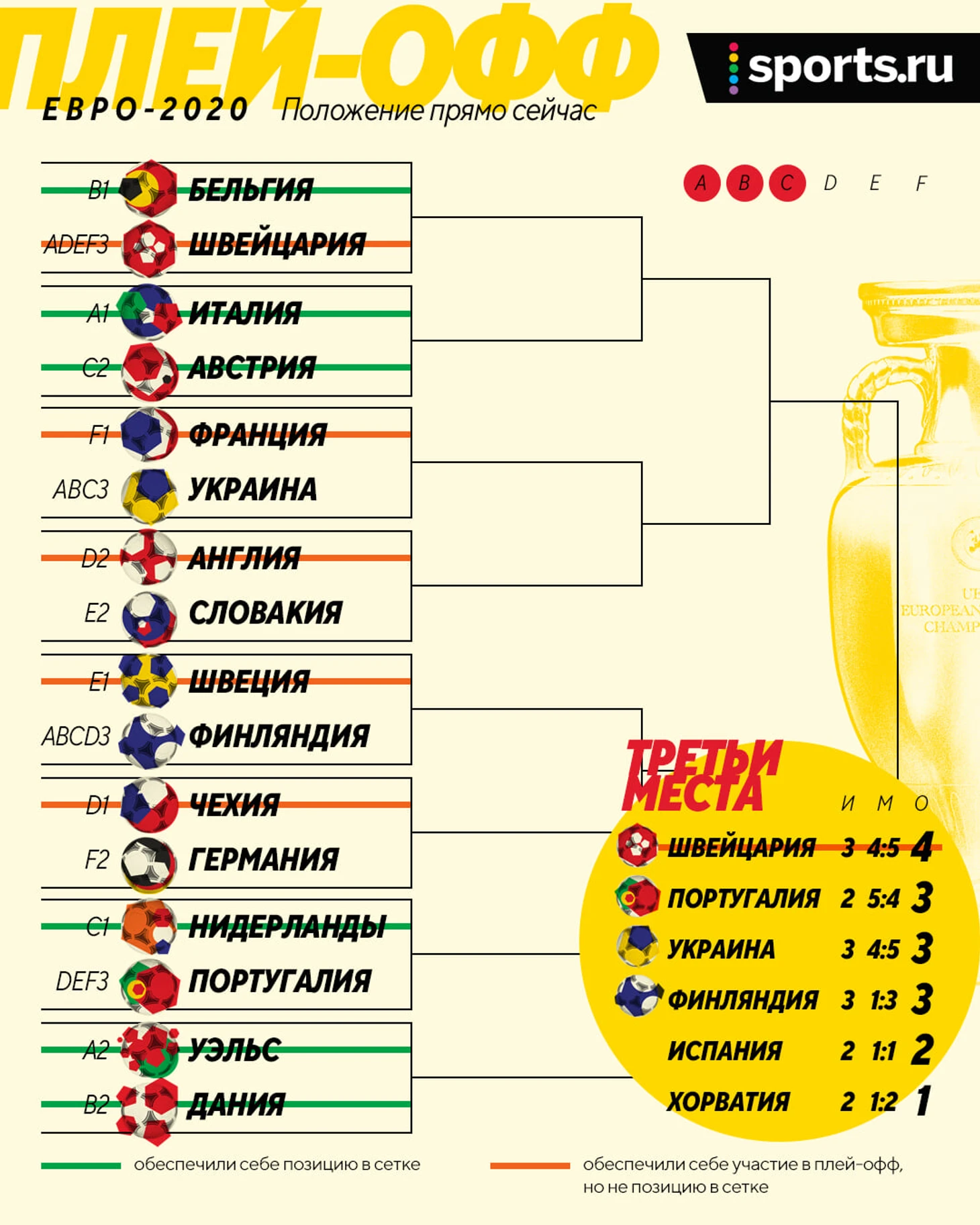 • Мы знаем уже много команд, которые точно сыграют в 1/8: Бельгия, Нидерланды, Италия, Уэльс, Дания, Австрия, Швейцария. Плюс нужный очковый порог (развязки в группах B и C подтвердили, что 4 очков хватает для плей-офф) уже преодолели Англия, Франция, Швеция и Чехия – в 3-м туре они решат, с какого именно места выходят.