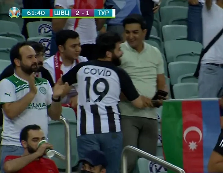 Мы уже показывали самых колоритных болельщиков Евро-2020, но за последние дни список пополнился. Например, на трибунах стадиона в Баку появился некий Ковид под номером 19. Судя по всему, он играет за «Нефтчи».