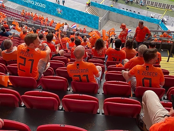 А в Амстердаме уже подготовили ответ: на «Йохан Кройфф арене» заметили трех друзей в футболках с фамилиями Pfizer, Moderna и A. Zeneca. Как вы уже догадались, это 3 вакцины против коронавируса, одобренные в Нидерландах.