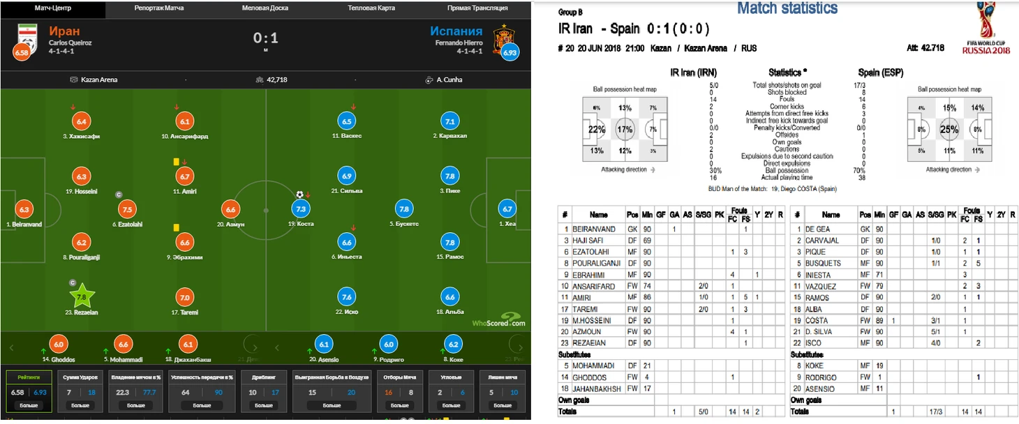 Сразу вспомнилось еще пару интересных событий. Например, чемпионат Мира в России и матч Ирана с Испанией. Очевидное, неоспоримое преимущество, которое подтверждает whoscored, но ставит под сомнение ФИФА.
