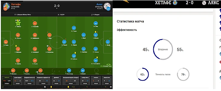 Вы думаете такие разбежки возможны на больших владениях? На помощь приходит матч Хетафе и Аякса в плей-офф прошлого года Лиги Европы. Хетафе интенсивно прессинговал, спору нет, но сам практически не играл через короткий пас – только выносы. Аякс Тен Хаага играет в контроль и умеет разбивать прессинг пасом, что в принципе и было. Как УЕФА пришел к таким цифрам, уму непостижимо. Я еще могу допустить 70% вместо 78%, но 55% вместо 65% это как?