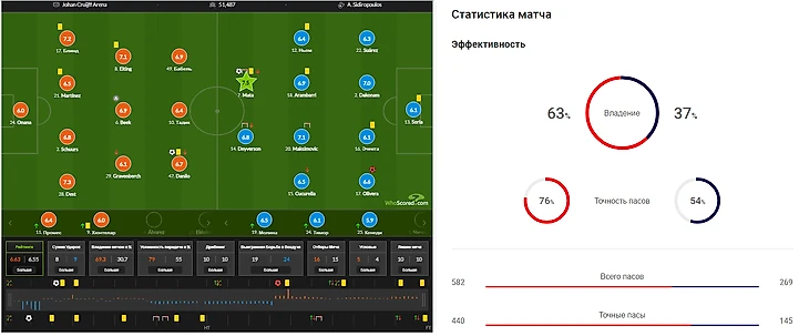 В итоге – на whoscored 76.6%, на УЕФА – 69%. Причем, в одном из последних обновлений перед финальным свистком проскочила цифра 68%. Заодно обратите внимание на разницу в точности пасов. Их же в принципе было немного, как можно так ошибиться?