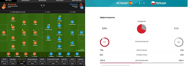 Подходим к главному. Какой матч, даже не вызвал сомнения, а в полной мере возмутил и заставил писать этот текст? Испания – Польша. Что конкретно возмутило? На моем рабочем месте два монитора. Так вот на одном была открыта трансляция, на другом – по пол экрана статистика УЕФА и whoscored. Конкуренцию по мячу Польша составила лишь в первые 5 минут. Уже к 15-й минуте (по whoscored) у Испании было более 70%, к 20-ой – 76% и ниже этой цифры уже не опускалось. Но все равно УЕФА умудрялось периодически опускать владение до 69%. Вот сидишь, смотришь – Испания с мячом. 2,3,4 минуты – все это время с мячом. А статистика идет в обратном направлении. Нонсенс.