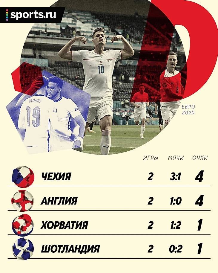 • Чехия закончит первой, если не проиграет Англии. Второй – если проиграет Англии, а Шотландия обыграет хорватов. Есть сценарий и с третьим местом: это поражение от Англии и победа Хорватии с нужным запасом голов.