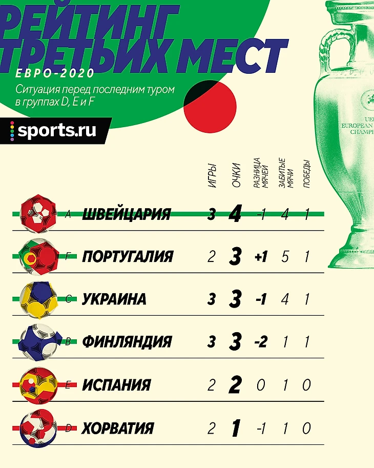 Остальные уже справились. Финиш групп A, B и C обрисовал контуры плей-офф – мы уже знаем 11 участников. Это победители своих групп Италия, Бельгия и Нидерланды, закончившие вторыми Уэльс, Дания и Австрия. Плюс забронировавшая место в 1/8 с третьей строчки Швейцария. Развязки групп B и C также гарантировали выход в плей-офф сборным Чехии, Англии, Швеции и Франции – у них по 4 очка, даже если кто-то из них свалится на третье место, они точно будут лучше Финляндии и Украины (по 3 очка).