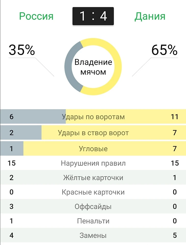 Что же мы получаем по итогу? Сборная Дании превзошла нас по всем параметрам. Единственное где мы им не уступили: это в нарушениях за весь матч и в жёлтых карточках. Но всё же такого разгромного поражения мы не заслуживали, просто удача была на стороне Датчан.