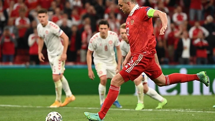В первые 30 минут скандинавы не могли найти свою игру, чем Россия не воспользовалась. Команды смотрелись блекло и тускло. Самым опасным моментом с нашей стороны можно назвать лишь проход Головина, который не смог забить Касперу Шмейхелю. Но всё изменил первый гол. Миккель Дамсгор исполнил великолепный удар и поразил сетку ворот сборной России. Датчанин стал самым молодым автором гола своей страны на чемпионатах Европы. Этот гол нельзя назвать случайным, но и сто процентым его не назовёшь. Поэтому поставим +/-