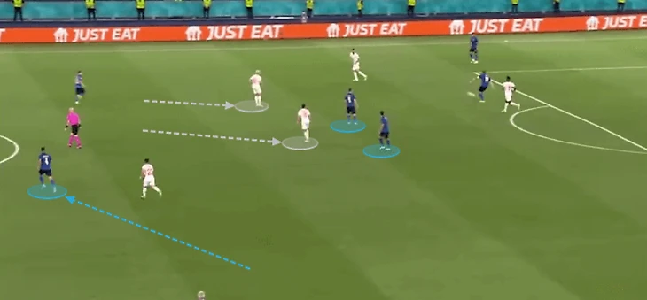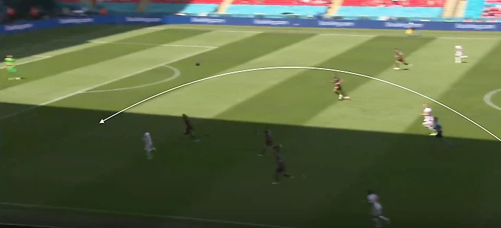 Еще один правша в роли левого фулбэка, но уже с совсем другими обязанностями - Киран Триппьер. В среднем Триппьер делал свои касания ниже, чем Спинаццола. (Киран не играл во втором туре, поэтому пример из первого) У Гарета Саутгейта в заявке присутствовали одновременно Люк Шоу, Бен Чилуэлл и Букайо Сака (все провели выдающийся сезон), но Саутгейт выбрал Триппьера по нескольким причинам. Во-первых, против Хорватии ему были нужны иные углы передач, чтобы продвигать мяч не как обычно (хорваты оказались к этому не готовы). Здесь Киран отдает на Стерлинга такую передачу, которую никак бы не отдал левша. Дальше Стерлинг находит Маунта, врывающегося в свободную зону.
