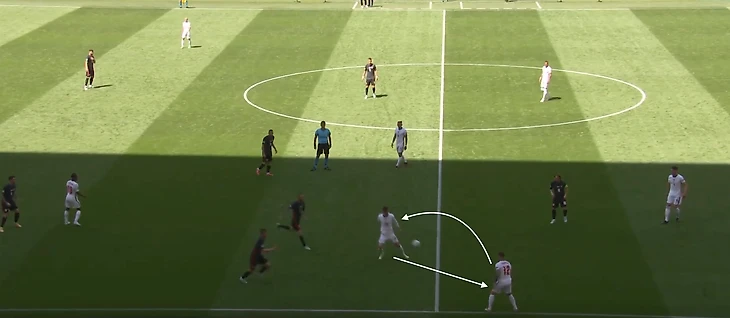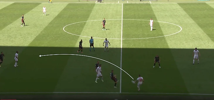 Похожая ситуация. Леандро делает ложное движение, резко уходит во фланг и подает. Идея использования инвертированного фулбэка совершенно точно не сработает со всеми игроками. Спинаццола превосходен за счет своей универсальности, что делает его уникальным игроком, которого можно использовать в этой роли.