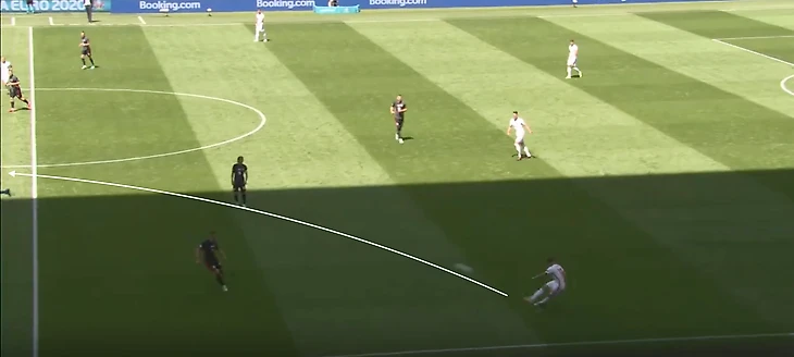 Леонардо крайне опасен при изоляции на фланге, он хорошо уходит в обе стороны, и прекрасно выбирает момент для подачи. Ему, конечно, удобнее смещаться в центр, тем более что чаще всего его оппонент правша, и получается, что оппонент Спинаццолы обороняется слабой ногой, поэтому факт, что Леонардо чаще уходит в центр не есть что-то выдающееся. Поражает то, что он так же качественно уходит и под левую ногу. А еще до сих пор ни разу не залез в офсайд, что впечатляюще для его роли и объема забеганий. Здесь Спинаццола обрабатывает непростой мяч, следующим же касанием ловит оппонента на ужасном выборе позиции и пробрасывает себе мяч, а дальше следует точный кросс на Иммобиле.