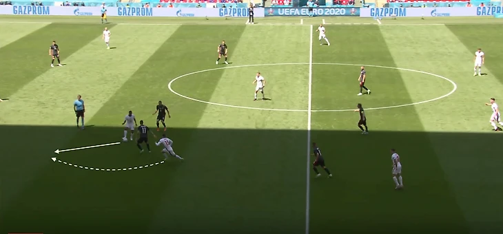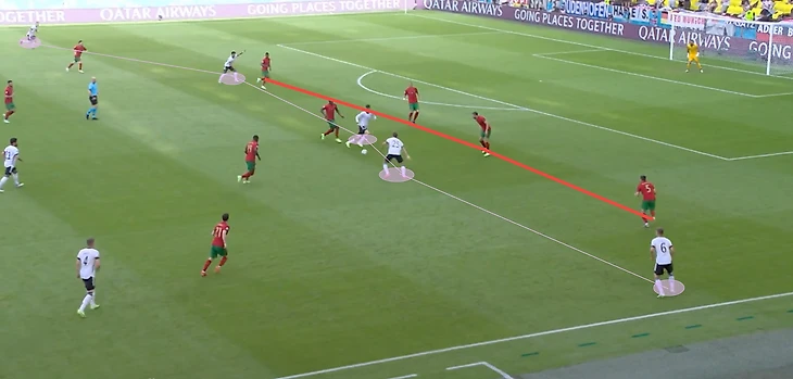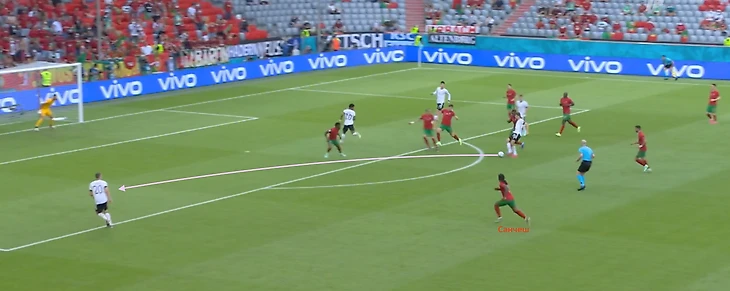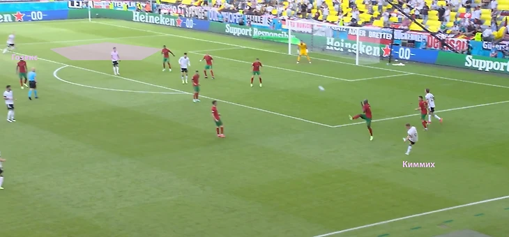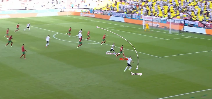 Когда Жота и Бернарду все же опускались, формируя сзади шесть в линию , то создавалось пространство для правого центрдефа немцев Гинтера, который быстро его заполнял и подавал на левую штангу.