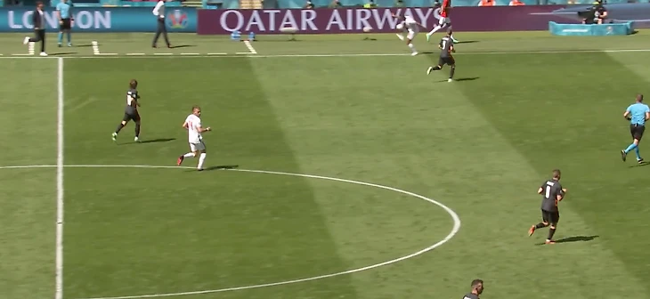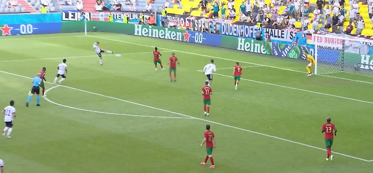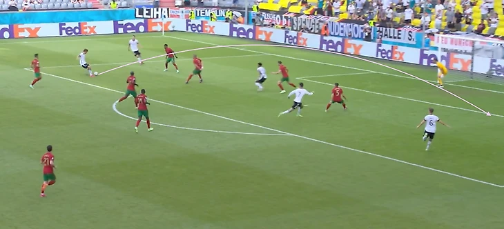 Киммих подает, и только посмотрите, сколько места на дальней штанге. Гозенс бежит туда с таким желанием, словно там разливают немецкое пиво. Дальше следует прострел в центр и завершение от лучшего бомбардира этого Евро (автогола).