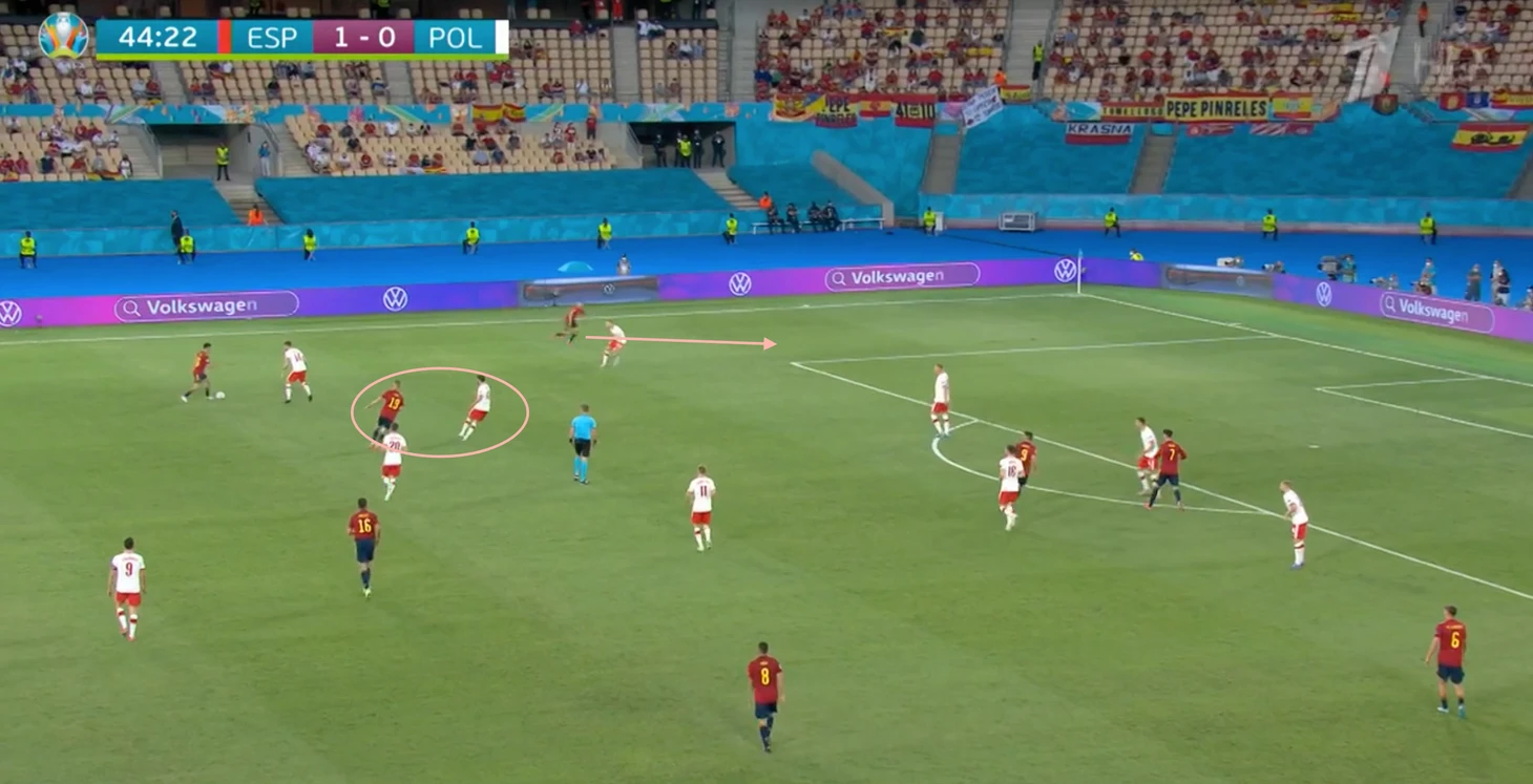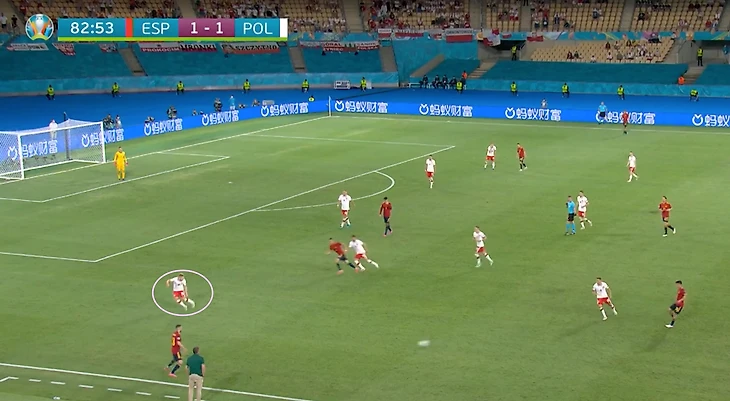 Подобные забегания за спину продолжались весь матч (пока ничего опаснее Луису Энрике поставить не удается), и в конце матча случился забавный эпизод. Альба буквально задергал Камиля Юзвяка своими рывками так, что в одном эпизоде, когда Родри только-только покатил мяч на Жорди, Юзвяк резко ускорился в сторону своих ворот, но Альба не сделал даже сантиметрового шага в сторону атаки.
