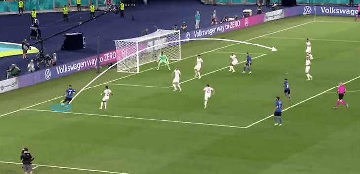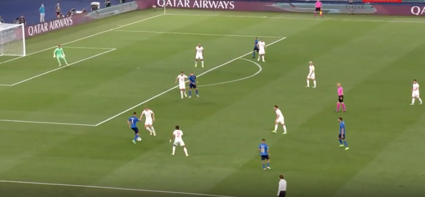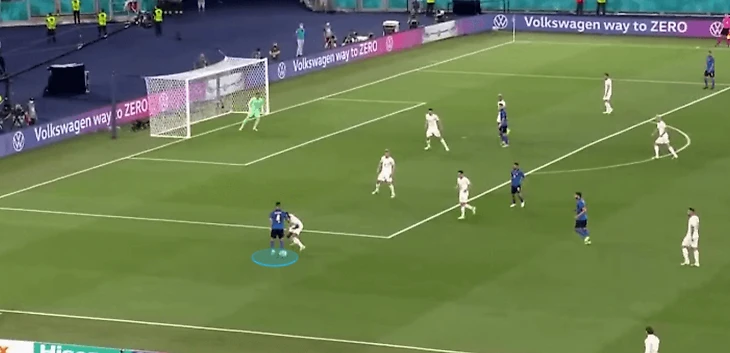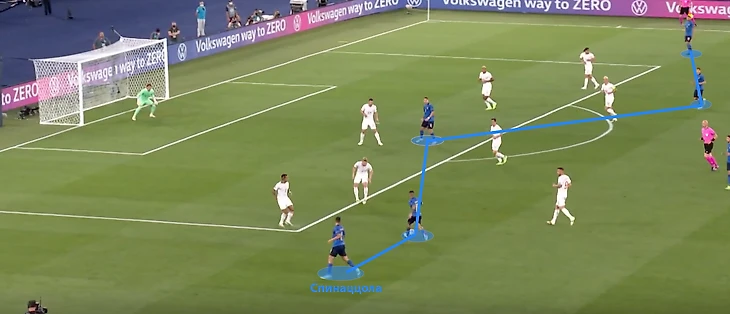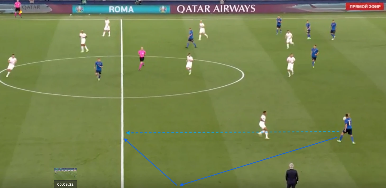 Здесь он увидел, что два опорника Швейцарии персонально играют по Жоржиньо и Локателли, оставляя центр поля пустым. Спинаццола врывается туда и просит передачу. Мяч до него не дошел, но решение само по себе смелое, за которое в случае провала можно серьезно поплатиться.