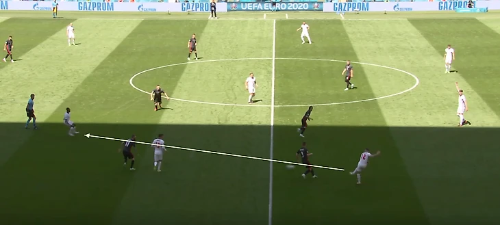 Все это, конечно, хорошо, но у такой роли есть минусы, которые всегда будут перевешивать. В традиционном стиле игры, когда вы продвигаете мяч вперед и созидаете, чаще будет происходить такая ситуация. Триппьер пасует на Стерлинга, и так как мяч идет по уходящей от центра траектории (в сторону аута), Рахиму приходится разворачивать корпус, а затем снова его разворачивать, чтобы продолжить атаку. Малейшая неточность в такой передаче и скорость атаки резко падает. В этом простом эпизоде англичане потеряли мяч.