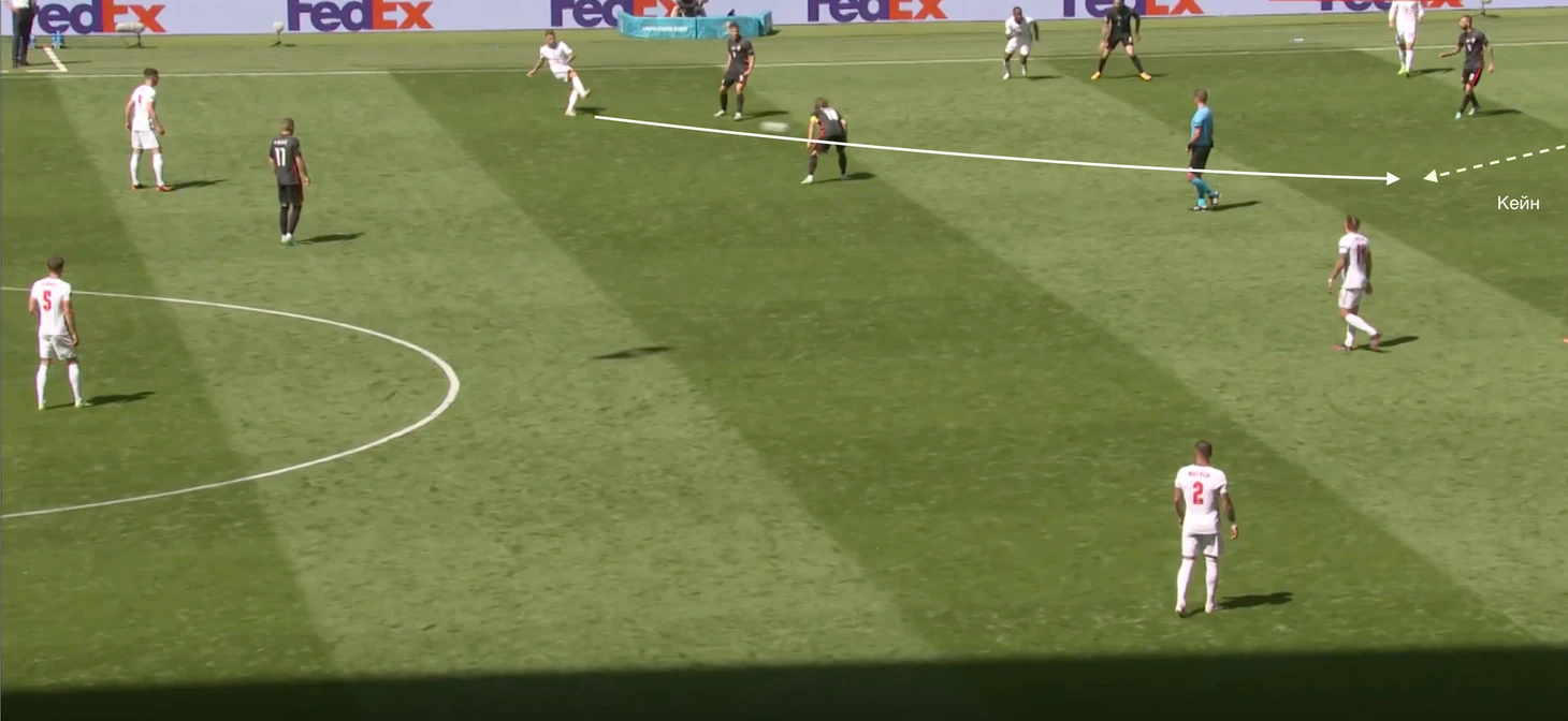 Очередная ситуация, которая выжимает все плюсы из правши. Киран пасует на оттягивающегося Харри Кейна, который умело ставит корпус, сохраняет мяч и продолжает атаку. Англичане наконец-то быстро продвинули мяч к воротам соперника.