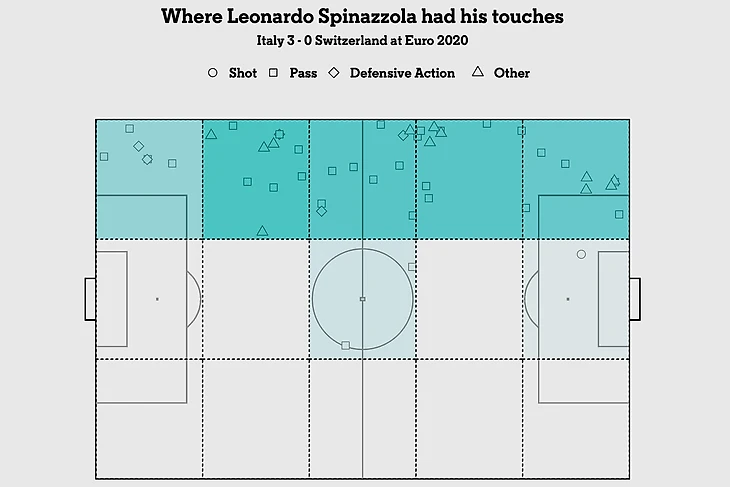 Из представителей первого класса на этом Евро можно составить следующий список: Ян Борил (Чехия), Йоаким Меле (Дания, пламенный привет Вадиму Лукомскому), Томаш Губочан (Словакия, привет летит Саше Дорскому), Киран Триппьер (Англия) и Леонардо Спинаццола (Италия). Известный принцип команд Манчини - линия из пяти атакующих игроков (да, как у немцев этим летом). Но почему Роберто выбрал не Эмерсона, способного с закрытыми глазами бегать за спину сопернику и открываться, а именно Спинаццолу? Все просто - Леонардо уникален, он вариативнее. Италия бОльшую часть матча, независимо от соперника на этом Евро, проводит на чужой половине, а Спинаццола бОльшую часть матча принимает решения на углу штрафной площади соперника. От туда он может как смещаться в центр, так и блестяще убирать под левую и подавать. Вот карта касаний Спинаццолы в последнем матче против Швейцарии. Обратите внимание, как много касаний в и около штрафной соперника. Итальянец весь матч бомбардировал соперников рывками.