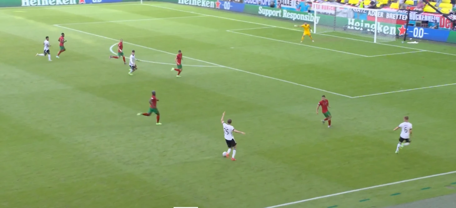 Наверное вы уже осознали, в чем кроется успех сборной Германии, но этого не показать я не могу. Фернанду Сантуш поменял Бернарду на Ренату Санчеша, потому что второй потенциально лучше справляется с оборонительными задачами, но даже он не успевал за подключениями Робина, а порой и вовсе даже не думал смотреть в его сторону. Мюллер видит пустую зону, рельсы и электричку (так называют Гозенса в Германии), которая несется по ним. А дальше катбэк и гол. Свет. Занавес.