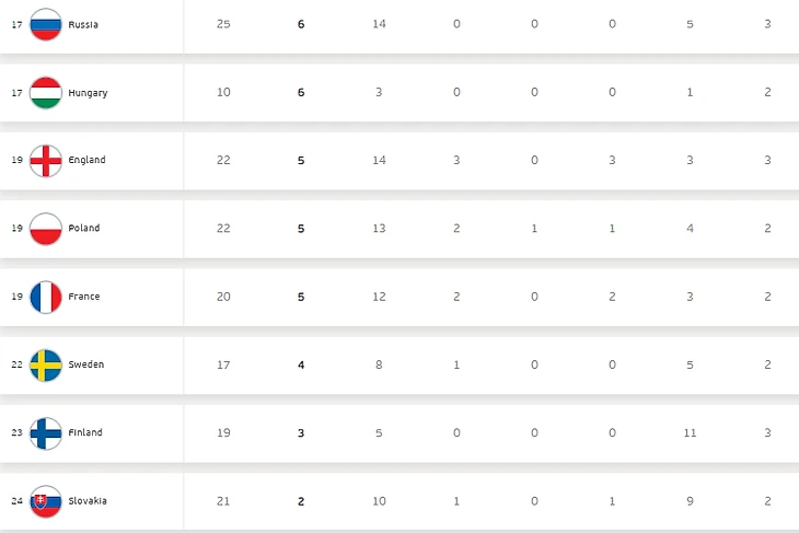 Меньше англичан на всем Евро били в створ только финны (3), шведы (4) и словаки (2), причем, шведы и словаки провели еще только 2 игры.